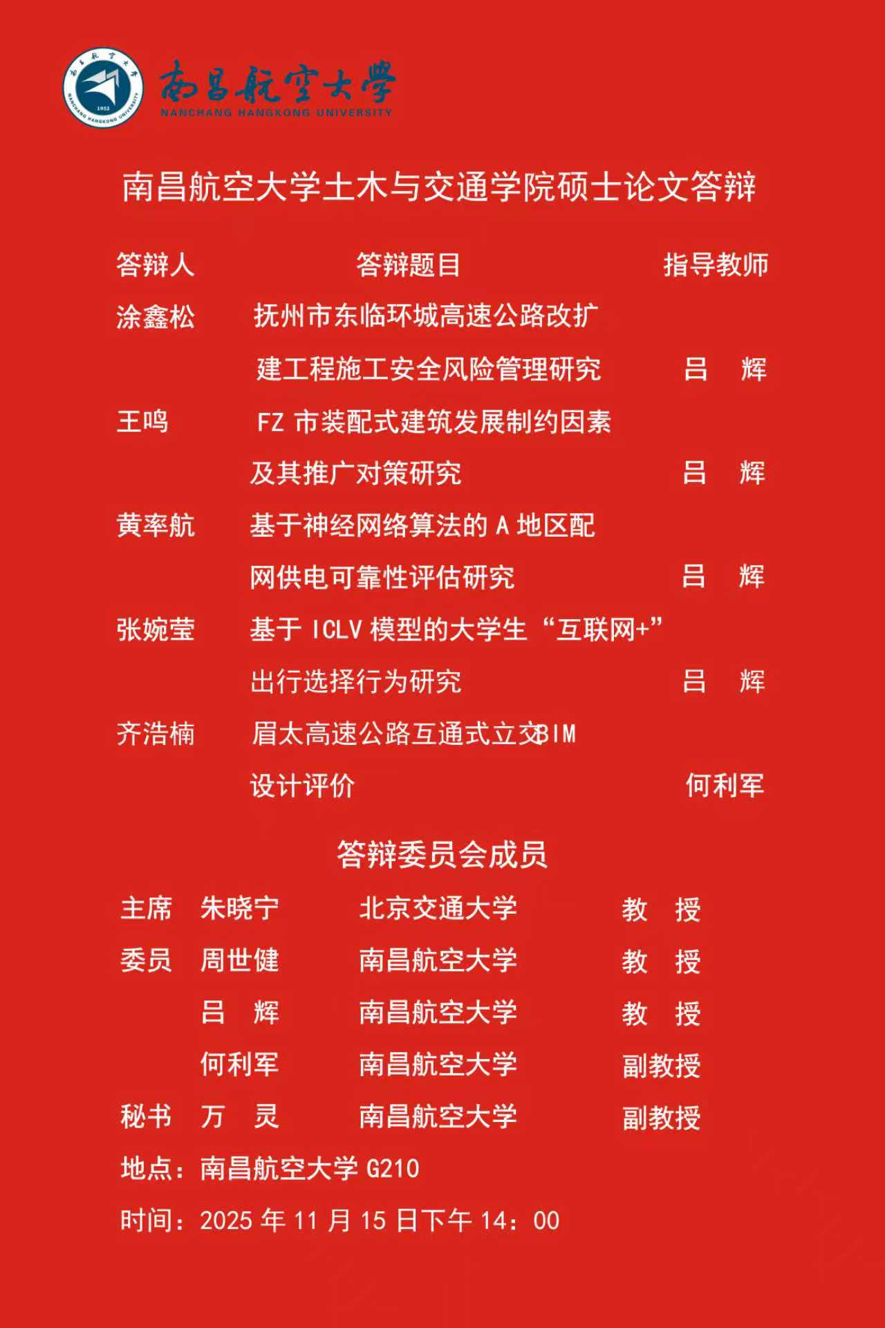 答辩预告 来源: 发布时间:2025-11-13 16:51:28 浏览次数: 次 【字体:小 大】 南昌航空大学土木与交通学院2025届硕士研究生学位论文答辩将于2025年11月15日(周六)14:00在G210教室举行。答辩名单如下: 责任编辑:阮铌雅 相关内容 【打印正文】